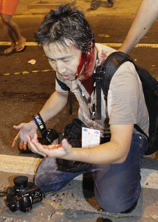 "Vi um manifestante cair no chão. Os policiais o agarraram e o levaram. Fotografava a cena quando fui bruscamente empurrado por outros policiais. Então levantei os braços com minha câmera para mostrar que era fotógrafo e que tinha intenções pacíficas, mas um policial de uniforme e escudo me acertou a cabeça com o cassetete." - revelou.