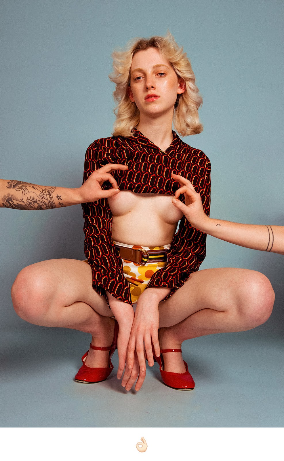 Com a mistura de uma estética pornô setentista e uma paródia com os ícones utilizados nas redes sociais e aplicativos de mensagens, a fotógrafa londrina Steph Wilson criou um ensaio para a revista Dazed & Confused, discutindo a censura na internet.