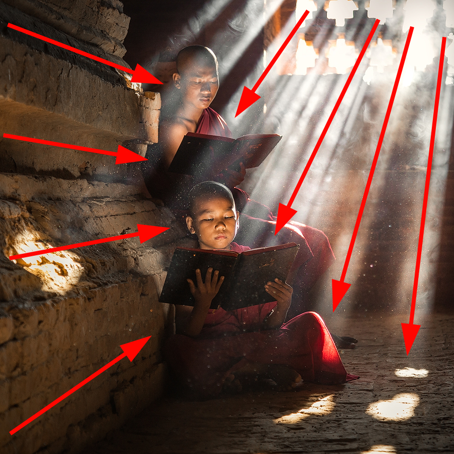 O foco era os monges, mas eu também queria capturar a luz ambiente e usar os raios de sol que entravam pela janela como uma fonte de direção. Ao compor a foto com os monges sentados sob os raios de luz eu fui capaz de desenhar foco para baixo, para seus livros enquanto usava a parede a esquerda uma linha em direção a eles.